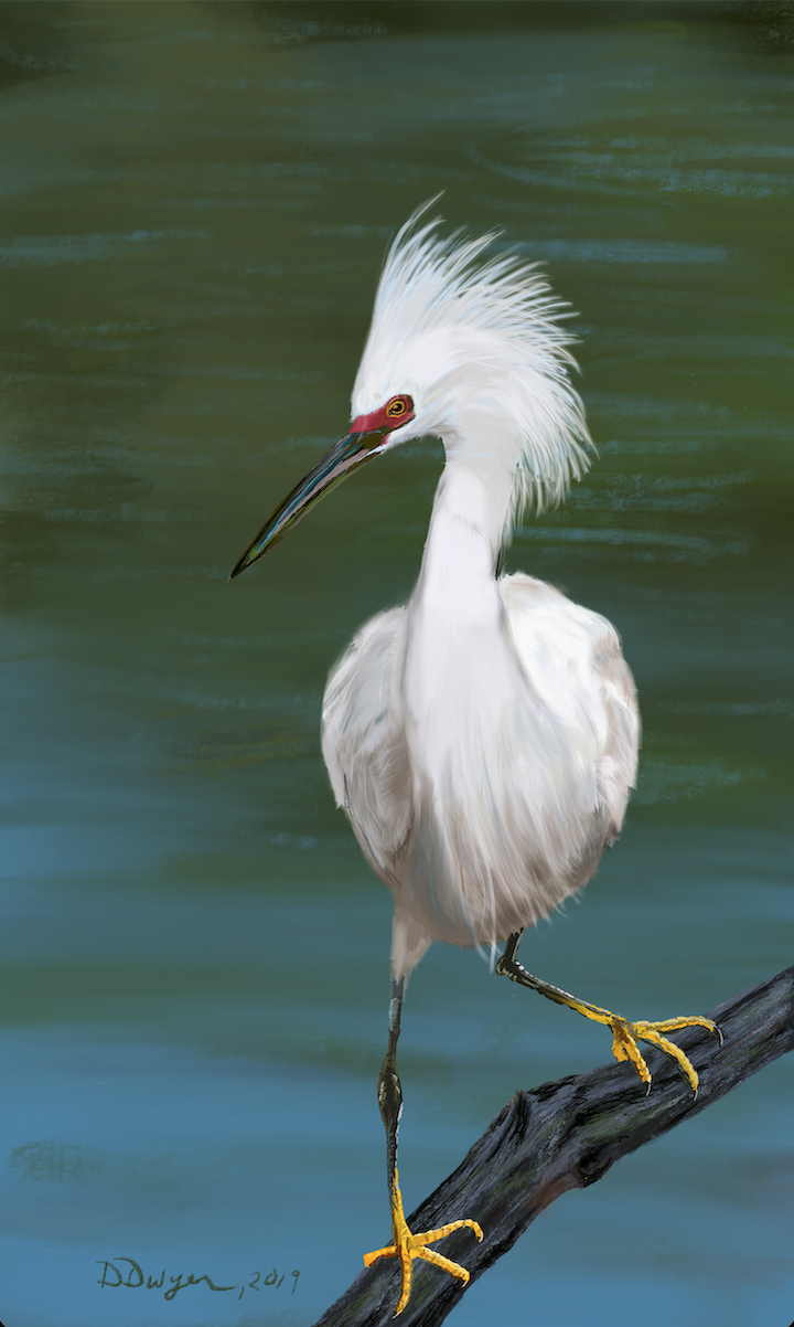 It’s hard not to be mesmerized by Snowy Egrets. They are always striking additions to still waters, especially in the spring, when their plumage is at its showiest—long, silken, flowing on a breeze. If you are lucky and get a close look at one at the beginning of breeding season, you may see the featherless skin at the base of the bill turn from its normal yellow to a deep red.